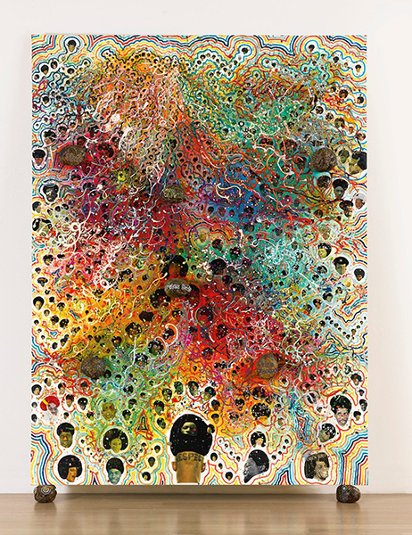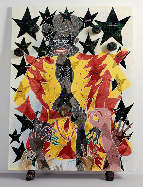 The Adoration of Captain Shit and the Legend of the Black Stars (2nd Version), 1998 Acrylic, oil, polyester resin, paper collage, glitter, map pins and elephant dung on canvas, with two elephant dung supports ©Chris Ofili
